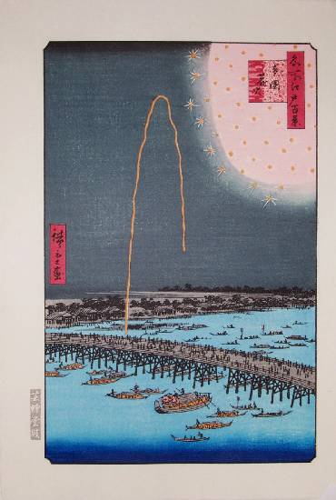 A spectacular Hiroshige fireworks image; faithfully re-carved and hand-printed. |