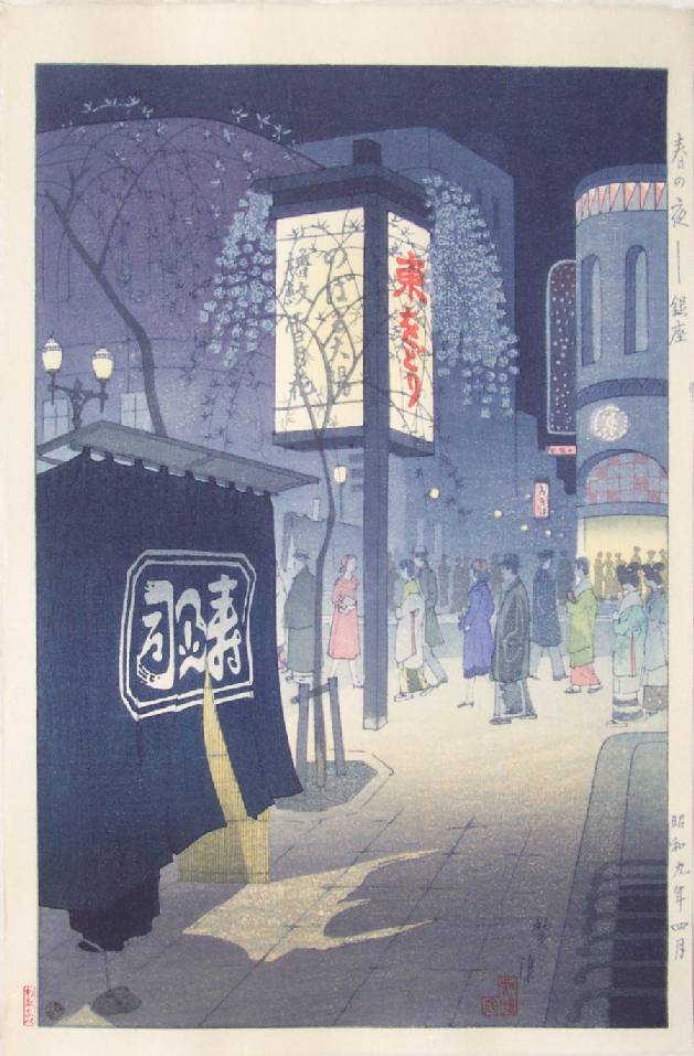 Reissued in mid-2002 by Watanabe using their original woodblocks from 1934, as discussed in "June 2002 - Shiro Kasamatsu's "Spring Night on Ginza" Re-issued by Watanabe." |