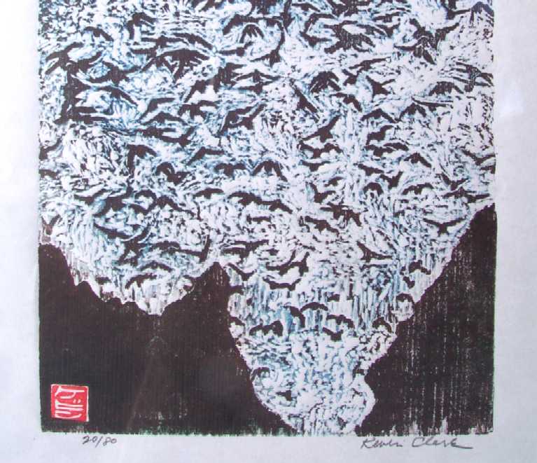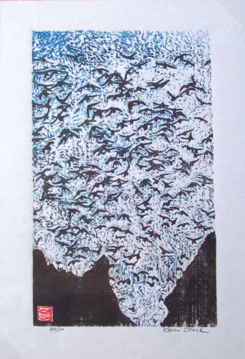 As seen by different eyes--this print depicts crows, seagulls, or even bats flying enmass against the soft