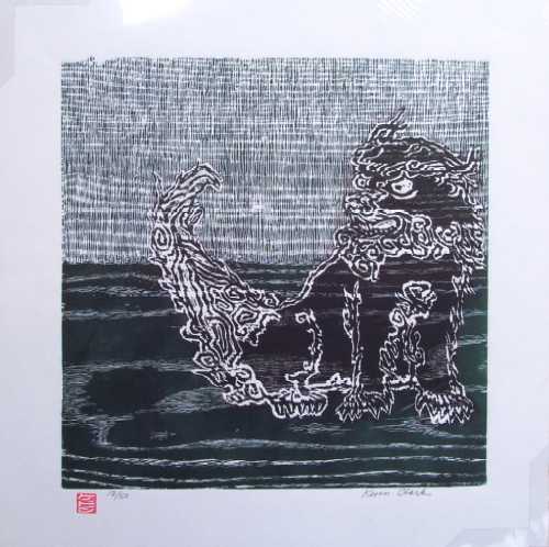 Big and bold--this print depicts a "shiisa" (or guardian lion) set against a greenish background. Typical of