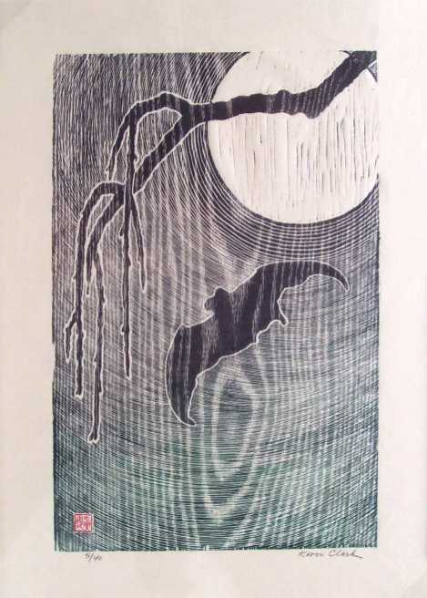 of concentrically carved circles--typical of many of Clark's prints which emphasize highly visible natural "woodgrain."