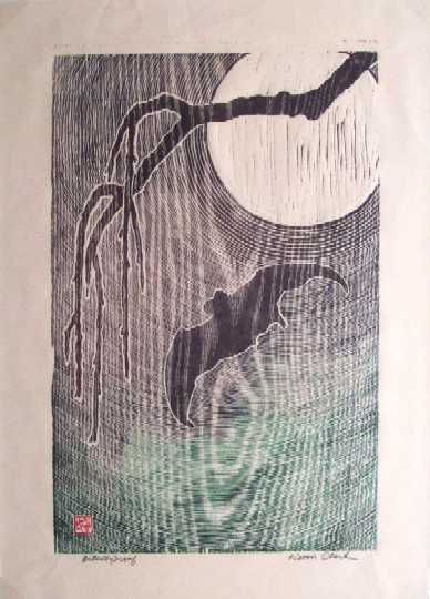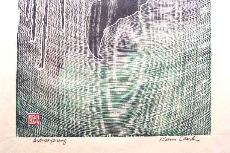 of concentrically carved circles--typical of many of Clark's prints which emphasize highly visible natural "woodgrain."