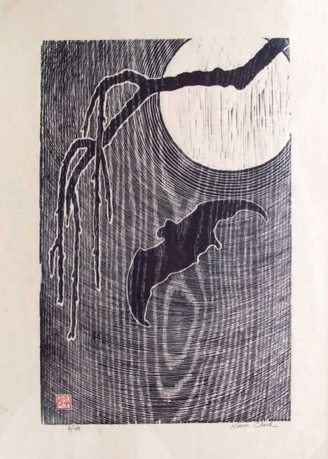 Striking--this print depicts a bat flying in