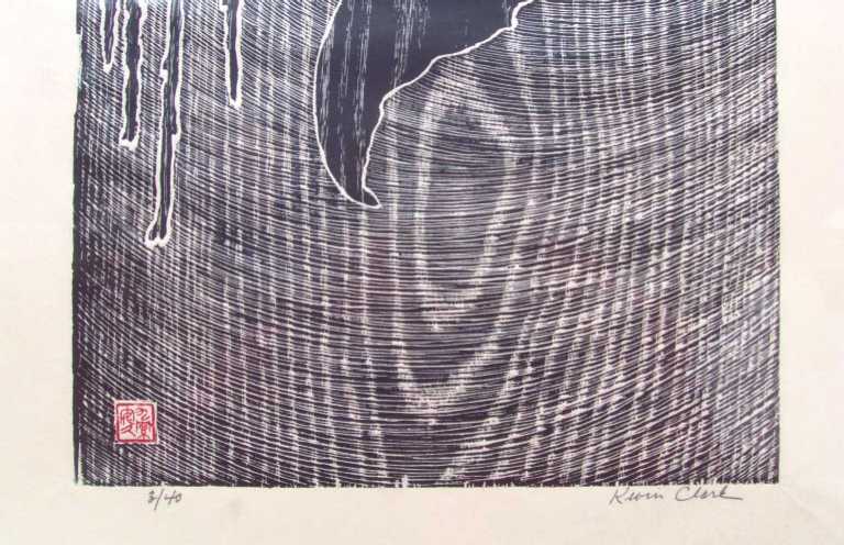 of concentrically carved circles--typical of many of Clark's prints which emphasize highly visible natural "woodgrain."