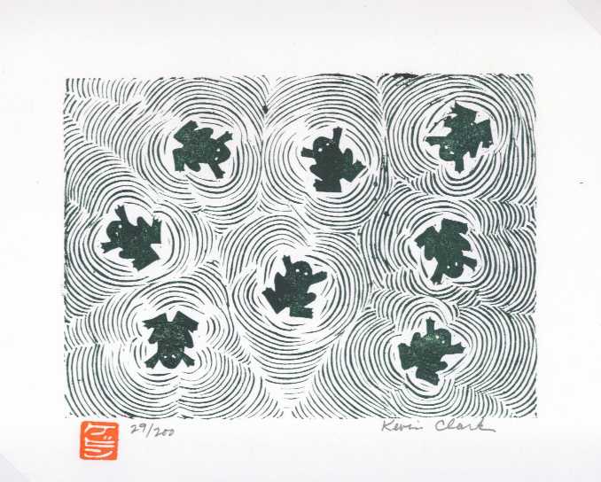 A whimsically designed print. Once full edition of 200 prints completed, Clark "strikes his initials" into the