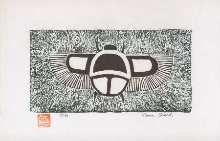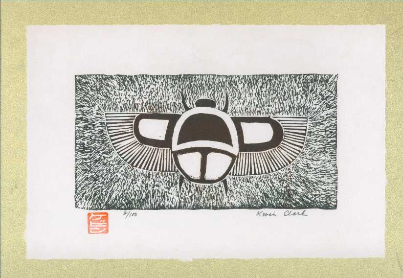 A print of an Egyptian beetle. Once full edition of 100 prints completed, Clark "strikes his initials" into the