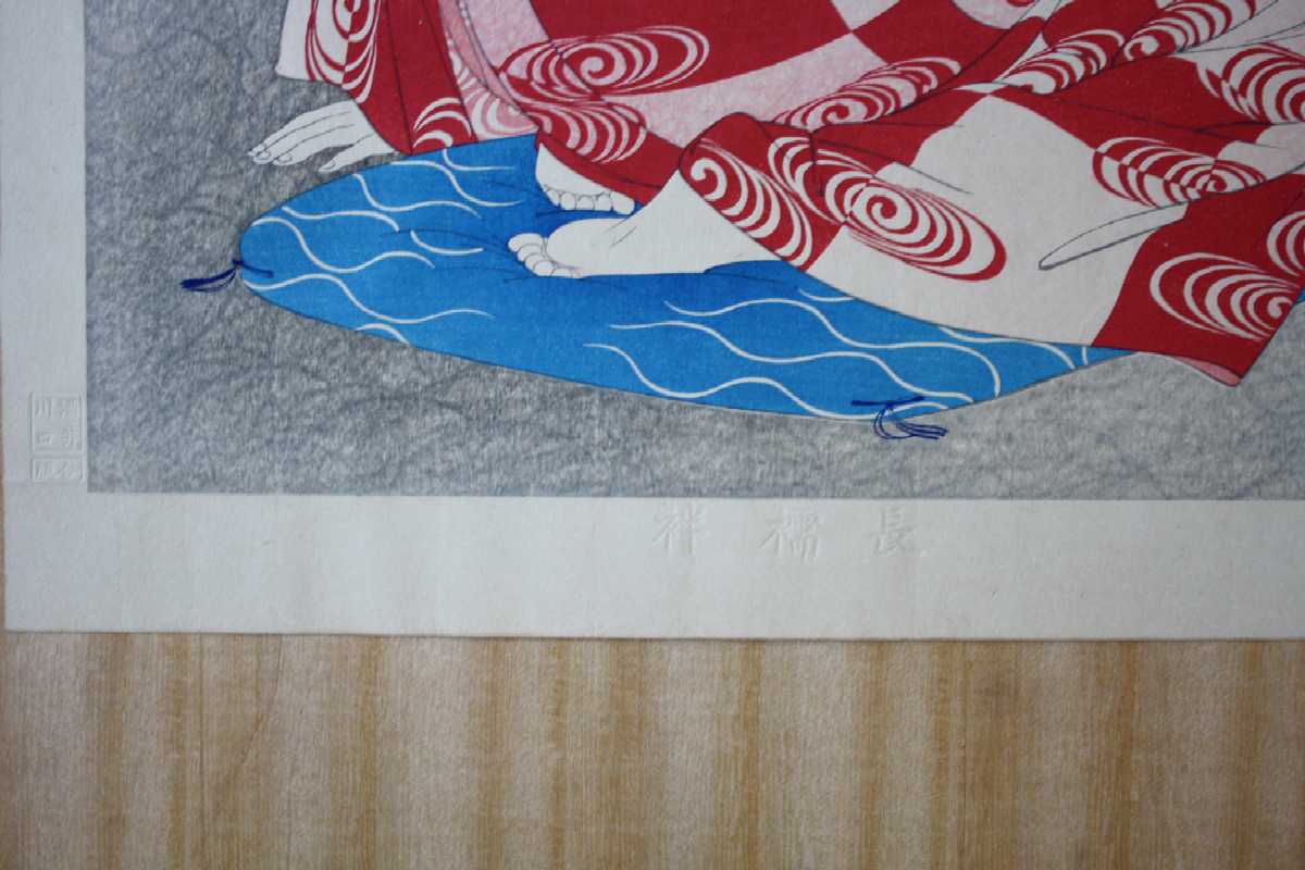 Very Fine. Superbly executed "bokashi" shading to face and pillow; "gauffrage"