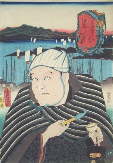 A interesting "Stations of the Tokaido" scene with an actor in foreground holding a pipe and smoking pouch. |