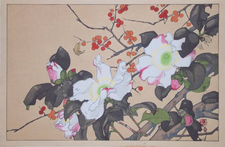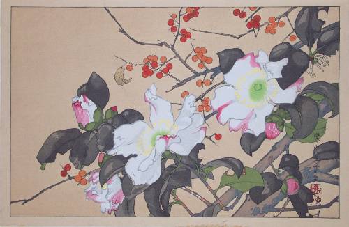 Colorful "kacho-e" (bird/flower) image by an artist whose works are not commonly seen. |