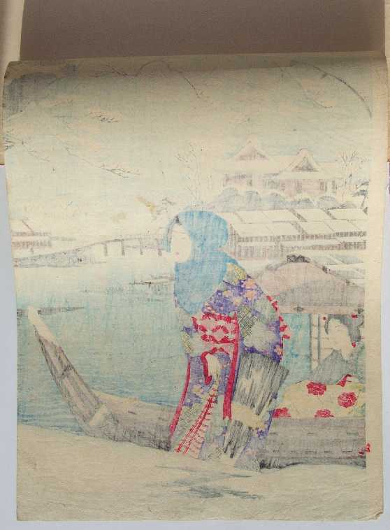 Snowy scene of pleasure boat along the Sumida River. Original 1880/90's print.