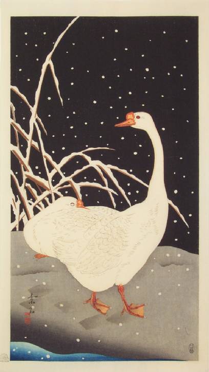 Very Fine. Superbly executed "bokashi" shading to background and to geese; light "gauffrage" to feathers and snow-covered reeds; nicely visible woodgrain; much fine detailing. |