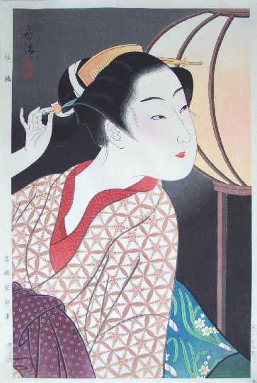 One of the splendid "bijin-ga" designs of the "shin-hanga" period--a young beauty seen before a Japanese