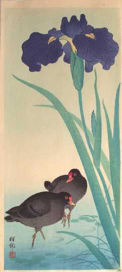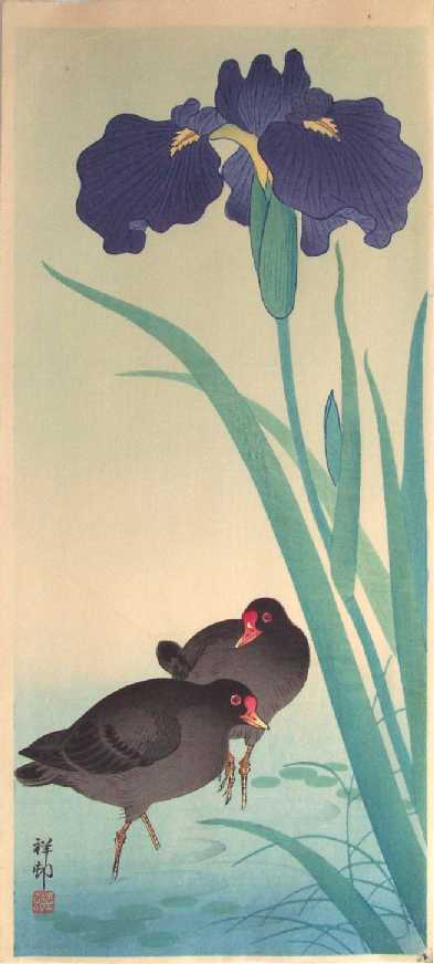 Colorful image of two moorhens wading below a flowering deep-purple iris. Flawless condition. |