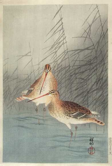 Two Bar-tailed Godwits wading in shallow water among reeds. |