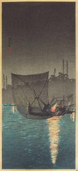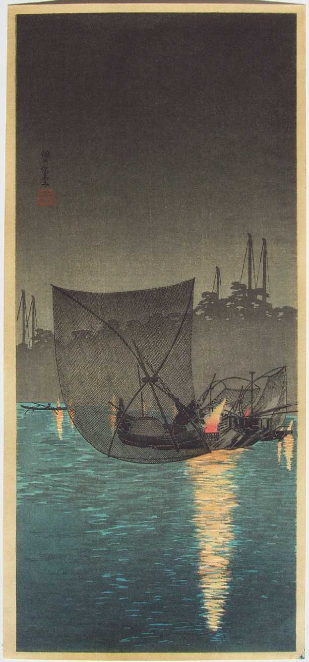A striking evening image with fishing net silhouetted against the sky at Tsukuda Island. |