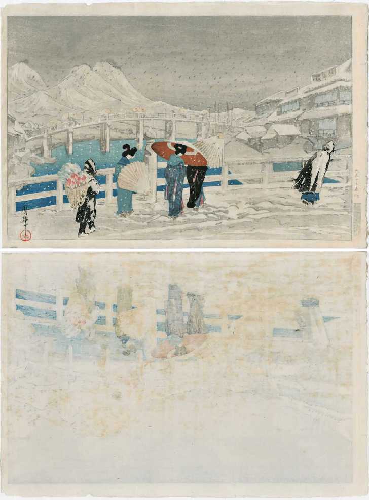 Beautiful wintertime snowscene with extensive "gauffage." Very rare, classic "shin hanga"