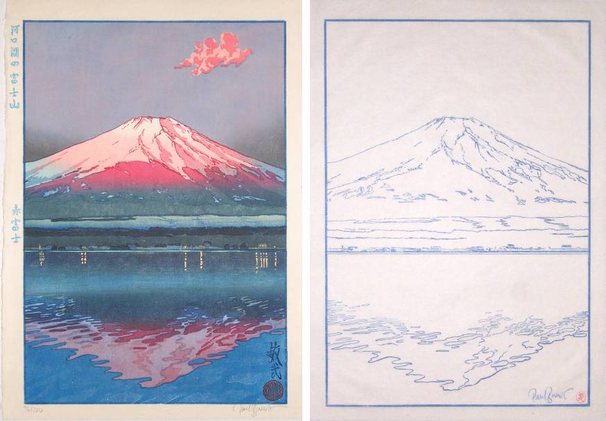 An EXCLUSIVE Ukiyoe-Gallery offering: A gorgeous reflected image of Mt Fuji as seen from Lake Kawaguchi PLUS the matching "keyblock" image. See John Fiorillo's webpage on