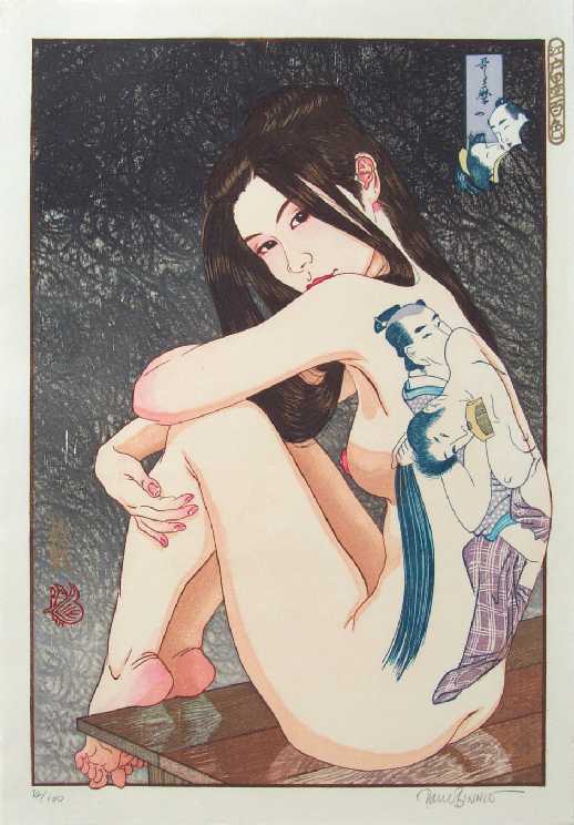 Nude with a large tattoo of "shunga" by Utamaro, this print utilizes much of the same "block-set" of the