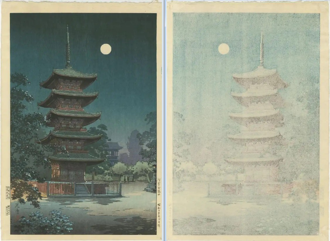Very Fine. Exceptional "bokashi" shading; distinctly visible woodgrain; highly detailed. |