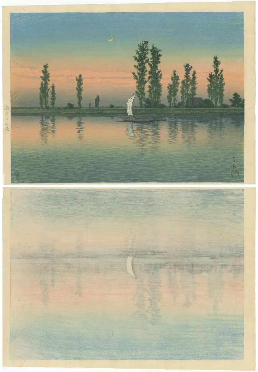 Very Fine. Superbly executed "bokashi" shading to sky and water areas; light "gauffrage"