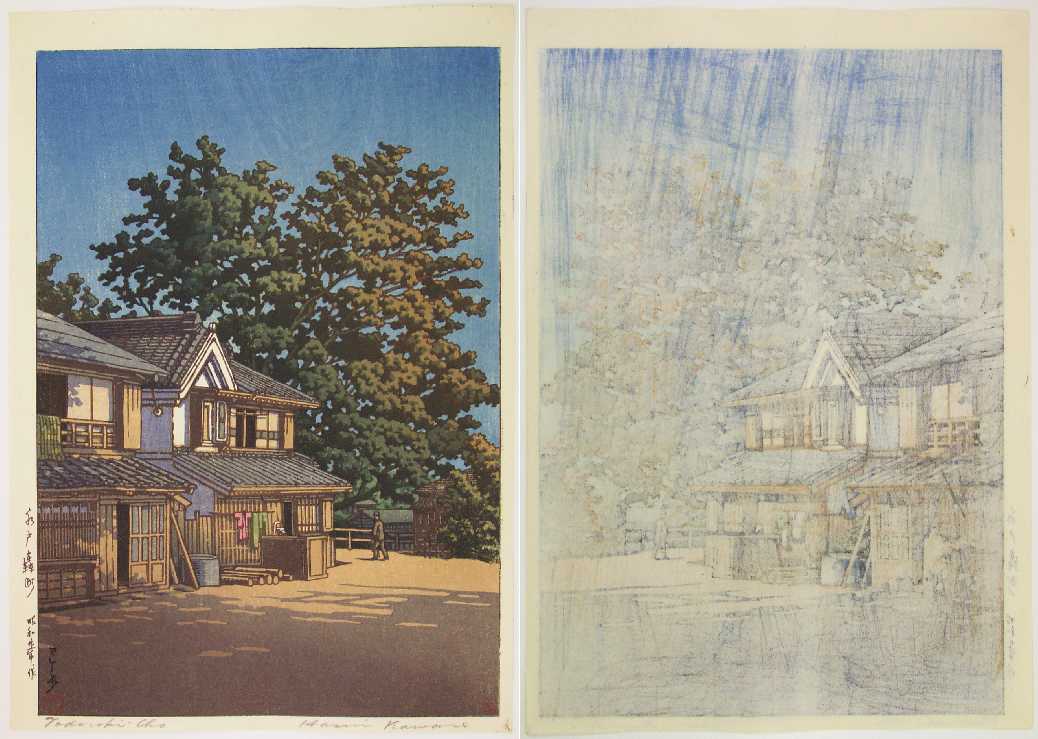 "gauffrage" to trees and house; nicely visible "woodgrain" to sky;