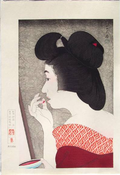 Fine. Overprinted hairlines; superb "bokashi" (gradation of colors) shading; "baren sujizuri" (circular traces) to background. |