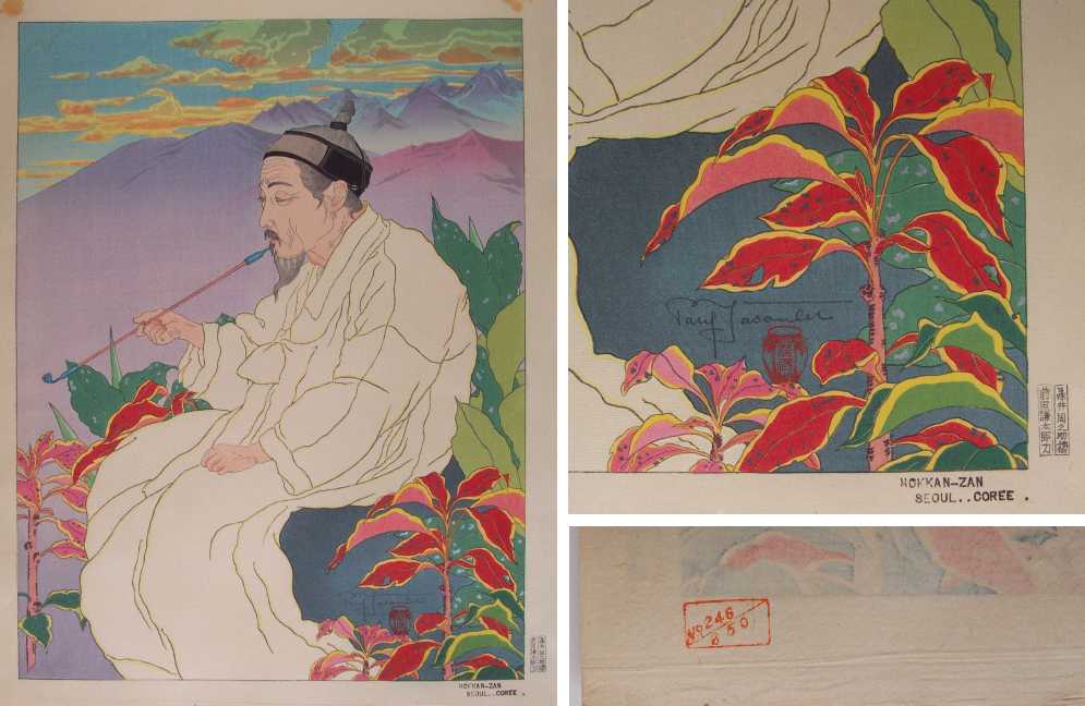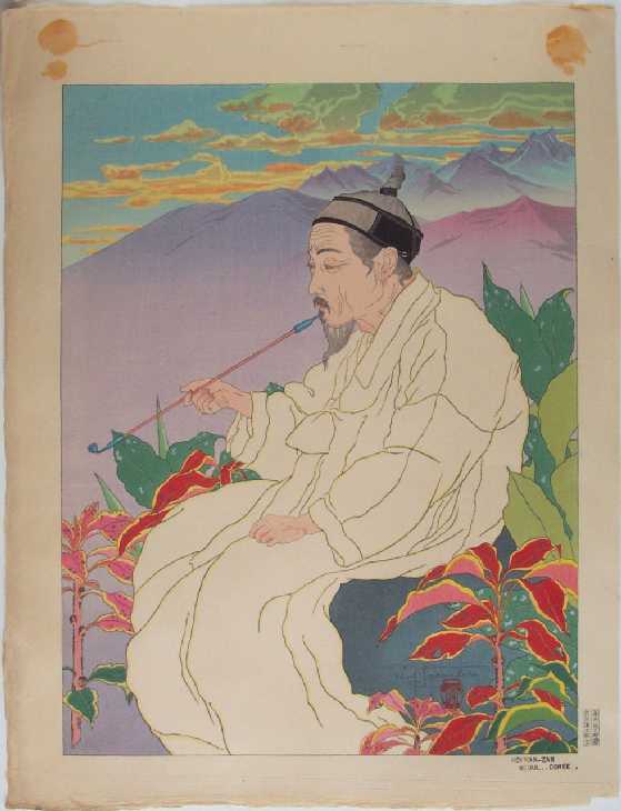 A delightful composition of a pipe-smoking Korean man. (#45 of Jacoulet's 166 lifetime images.) |