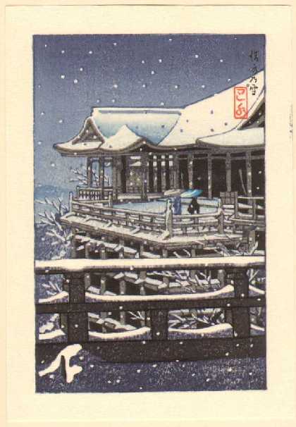 Colorful wintertime snow scene of Kyoto's Kiyomizu Temple. |
