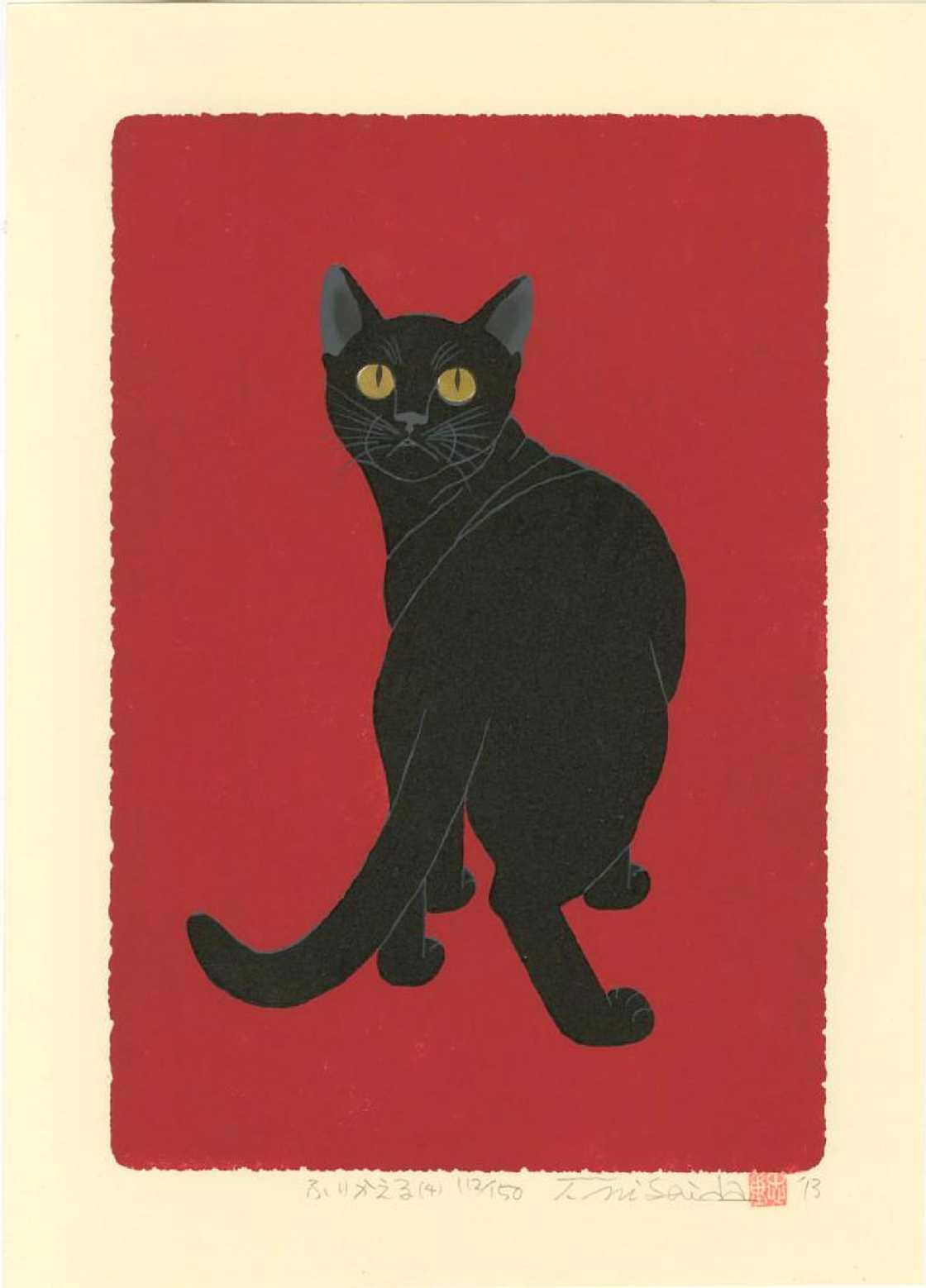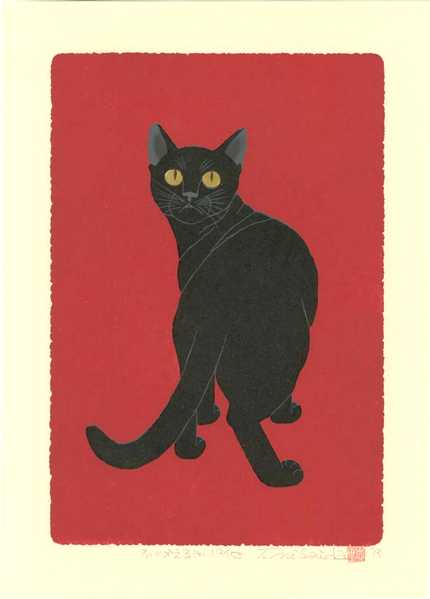 Boldly printed "semi-sosaku" (abstract) style. Skillfully printed; shiney black cat's body;