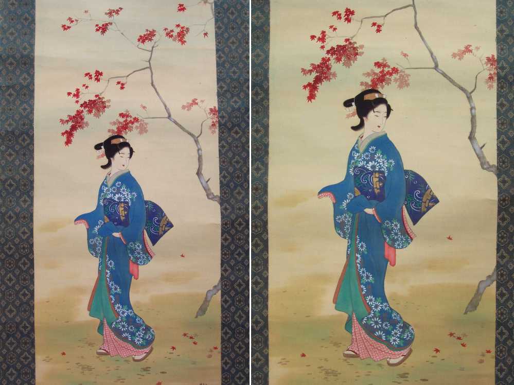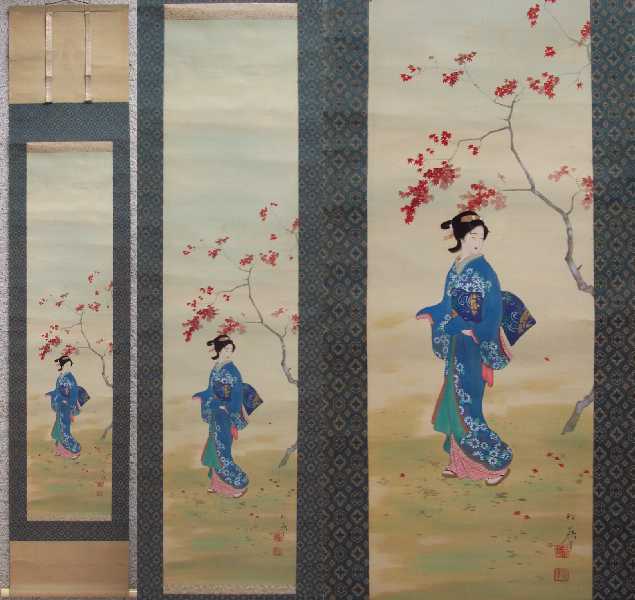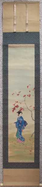 A wonderfully hand-painted "bijin-ga" image--nicely mounted as a hanging scroll. A unique,