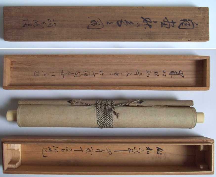 Entire "kakejiku" (hanging scroll) is 15 1/8 x 74 1/2 overall. |