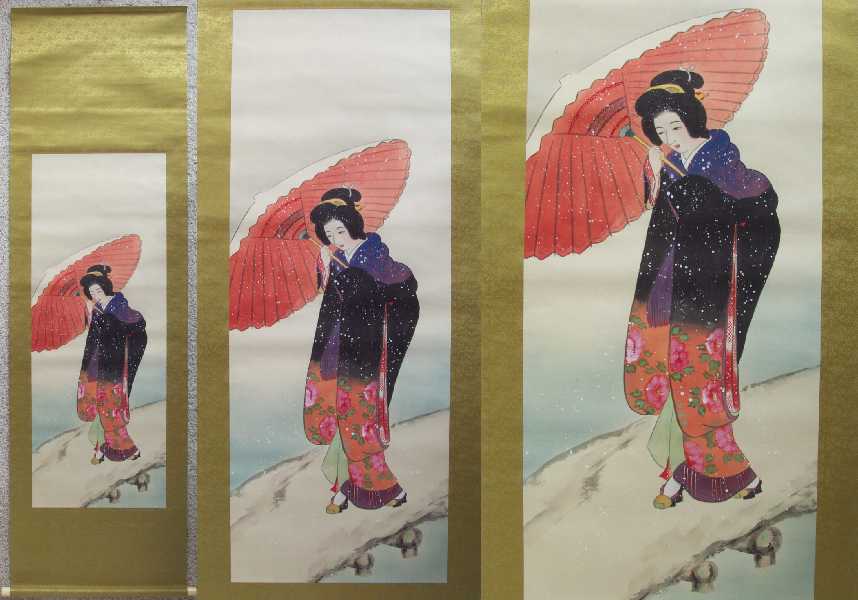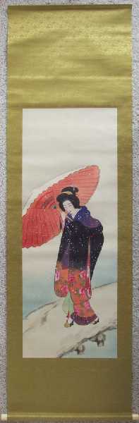 A wonderfully hand-painted "bijin-ga" image--nicely mounted as a hanging scroll. A unique,