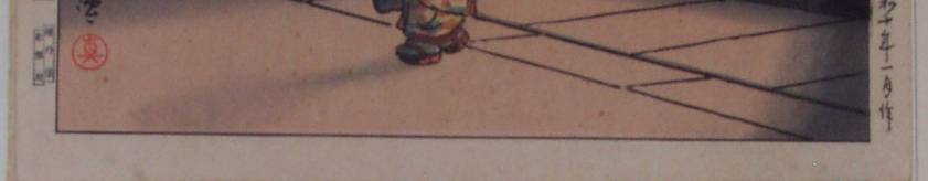 The earliest printing of our 9 prints was clearly the very "crisp" and softly orange-colored version that was sealed using the carver/printer combination of Katsumura/Tanbo. Again, Katsumura was one of Doi's earliest artisan carvers (worked for Doi only during the very early 1930's) and printer Tanbo (or Tanpo?), remains apparently unknown. Most striking and obvious about this print was the thinness and entirely UN-broken lower "key-line" border. In other words, any signs of block-wear are not apparent. Also convincing "evidence" of the very early printing of this copy is its light blue (upper right) margin seal which reads "Tokyo Fukei," or "Scenes of Tokyo" series. This same blue margin seal is also seen on all of the (early) "oban" Koitsu prints shown in the 1999 Chigasaki Museum's Koitsu Exhibition reference. Finally, the red, round "Koitsu" seal is also unique to this single print.