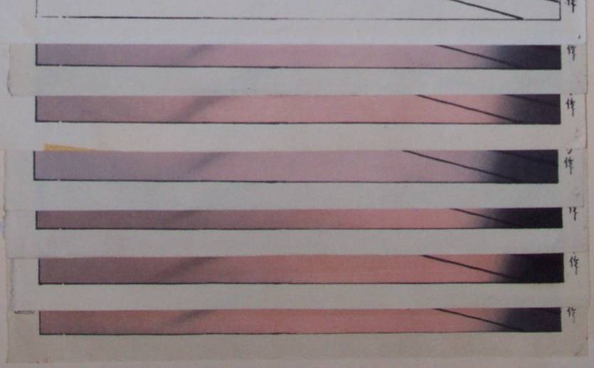 Finally, ALL of the remaining 6 color prints and the black/white "hanshita" were then observed to have their own common, but again unique set of line "breaks" and "thick/thin" line areas evidenced clearly in their "key-block's" lower margins. And don't be fooled by this Set "C's" apparent similarities to the above Set "B's" margin "key-line." If one looks closely and compares, he/she will note that these two sets ("B" and "C") are quite different.