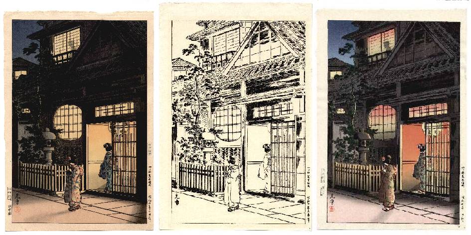 Above you see illustrated what simply appears to be two colored versions of Doi's popular "Tea House at Night" print sitting each side of this same print's "hanshita," or "key-block" outline. For completeness, this print is correctly titled "(Tea House) Yokocho at Yotsuya Araki" (in Japanese, "Yotsuya Araki Yokocho") and is margin-dated and therefore originally first published in "Showa 10 January," or January 1935. So already you're probably asking, "What's the big deal...?" Well, that's what I first thought a couple of months ago when I first received the paler-colored print seen on the right. In fact, for several weeks I didn't even notice that the arrival of this newly acquired print was raising.......