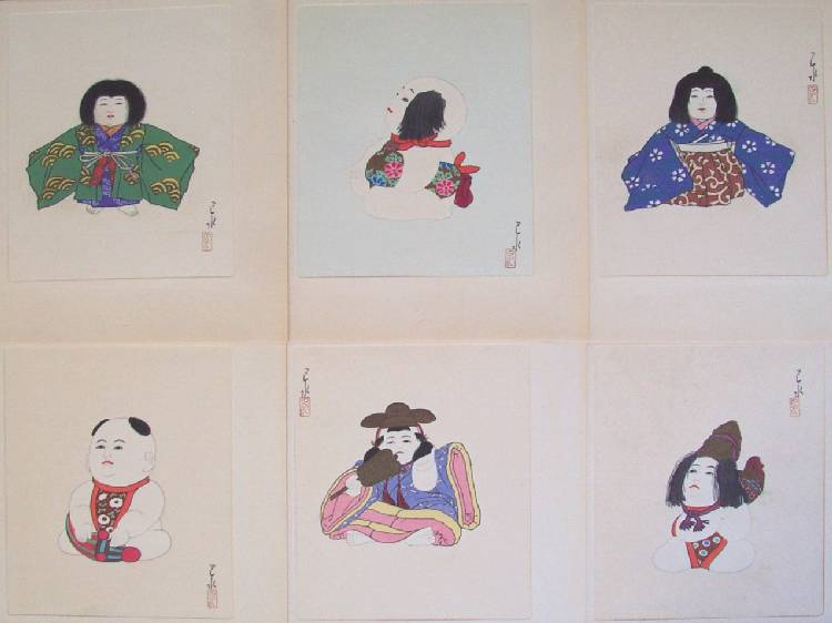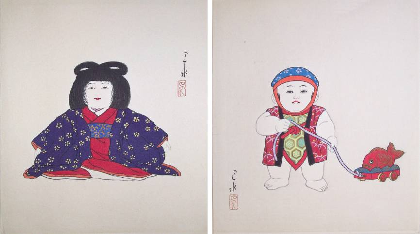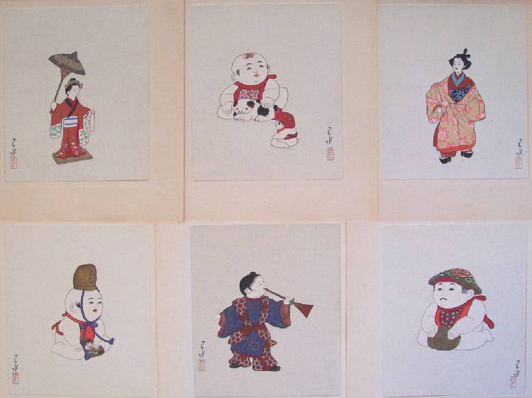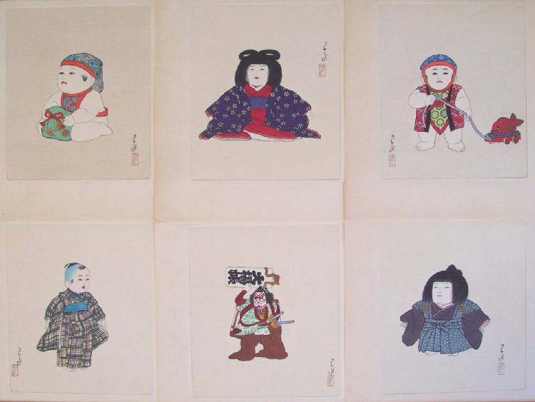 To collectors of Japanese woodblock prints by the artist KAWASE Hasui, the 24 various "Doll Prints" (done in a "squarish," 9 x 10-ish format) printed in 1935 are quite an unusual novelty. Not only are they seldom encountered, at the same time, little is known of them in the published literature of prints by this outstanding Japanese artist.