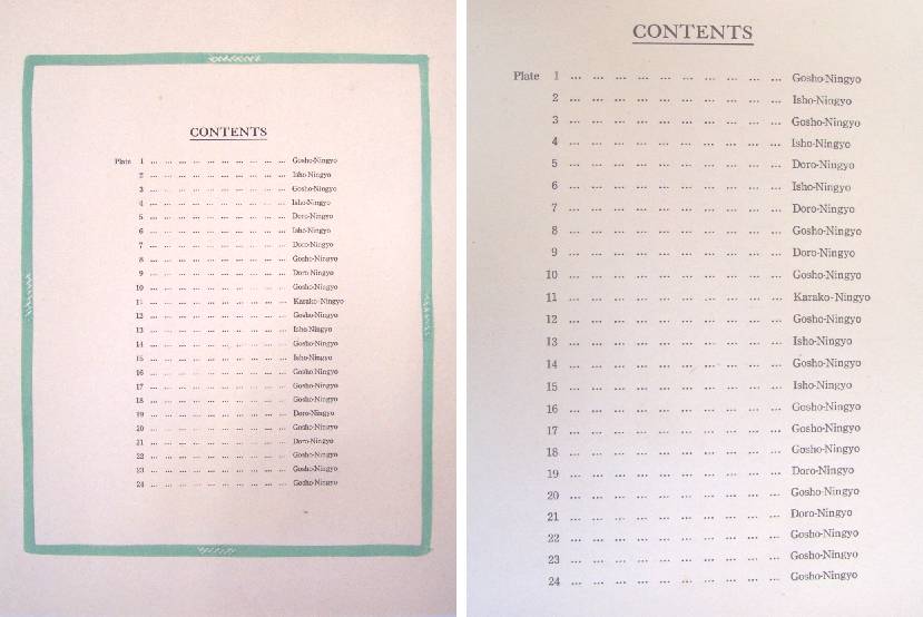 Seen in the following 4 images are color images of all 24 prints of Hasui's "Gyoso Ningyo" prints. They are shown in the same numerical order (left to right) as they correspond to the "Table of Contents" print listing seen above.
