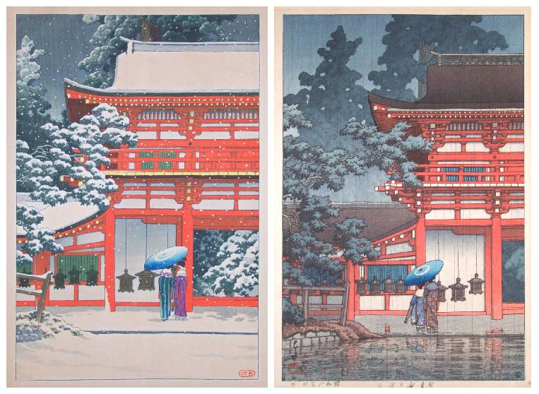 To collectors of Japanese woodblock prints by the artist KAWASE Hasui, the striking 1933 summertime image titled "Kasuga Shrine at Nara" ("Nara Kasuga Jinsha") published by Watanabe Publisher is quite well known (Narazaki #222). As such, it is among the handful of highly sought-after "red temple images" coveted by these collectors (see below, right). Much rarer, however, is the seemingly undocumented and very seldom seen "look-alike" print published by Shimbi Shoin Publisher (below, left) titled "Shinto Shrine of Kasuga at Nara" (ca1933-35).