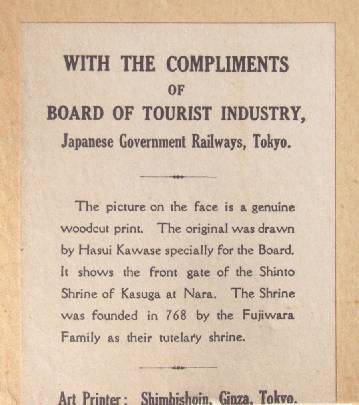 Althought this "winter Kasuga" print itself bears no title, no date, nor any publisher's identification on the print itself, according to the "Board of Tourist Industy -- Japanese Government Railways" sticker which is attached to the verso of this print's "presentation folder," we now know that this "winter-version Kasuga" print is published by Shimbi Shoin Publisher of Tokyo (sticker states: "Art Printer: Shimbishoin, Gizna, Tokyo").