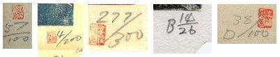 Shiro Kasamatsu's self-carved, self-printed and self-published prints commonly bear pencil written numbers in the lower right or left corner outside the printed area, which tell the edition size and number of the individual print. Sometimes the artist changed the position of the marking between the left and the right corner within one and the same edition.