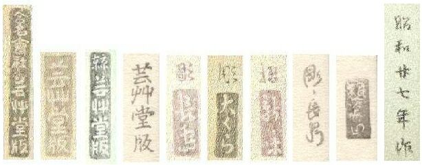 "Gomei Gaisha Unsodo Han" (Unsodo Publisher, Ltd.). Unsodo changed Showa 28 (1953) the legal entity from “Gomei Gaisha” into “Kabushiki Kaisha” and hence adapted the seal. |