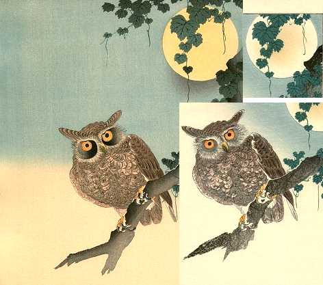 Koson's 1910-23 "Scops Owl on Branch, Full Moon" Print and Kono Bairei's "look-alike" Print