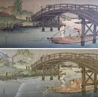 A Closer Look at Koho's "A Bridge in the Rainy Season" Print (top) and the "Look-Alike" Eisen Print (bottom)