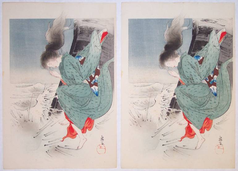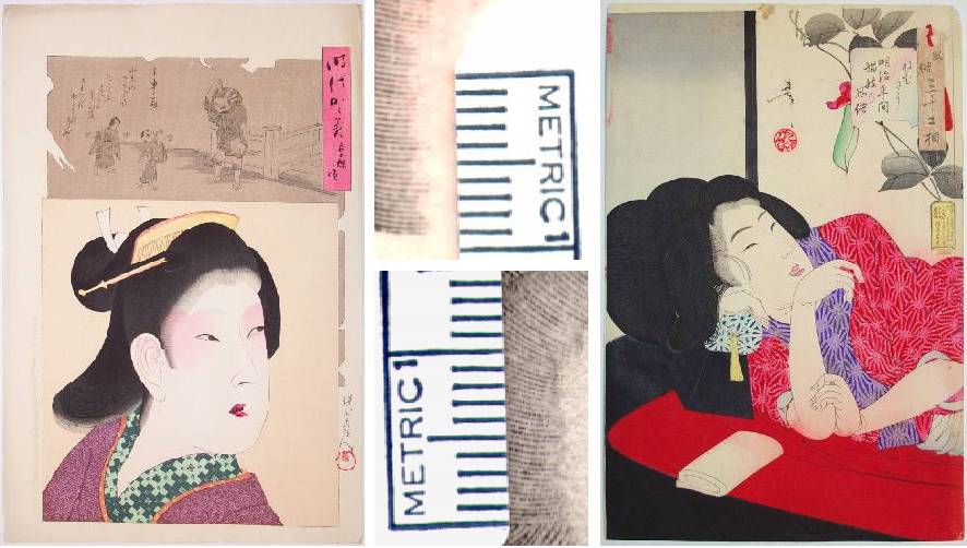 Over the years, being collectors of Japanses woodblocks ourselves, we have at times found ourselves amazed (if not downright dumbstruck) by the high degree of details that we at times have observed in our prints. And so, from time to time we have first recorded under magnification--then counted--the "number of hairs per centimeter" that these artisan carvers have been able to achieve using only their bare hands and a very sharp knife. During the past couple of years, the count had seemingly stalled at about 32-33 hairs carved per centimeter (or about 80 per inch!). Pretty impressive craftsmanship. Such detailed carving is seen in a variety of Meiji-era prints, such as the prints by Chikanobu and Yoshitoshi shown just below.
