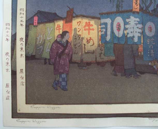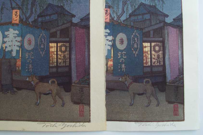 Toshi Yoshida's 1938 print "Supper Wagon" Seen just above is our second set of "same-as" prints--a pair of Toshi Yoshida's delightfully illuminated evening 1938 print titled "Supper Wagon." On the left is a slightly age-toned "life-time/pencil-signed" printing, and on the right we see a somewhat fresher looking "posthumous/block-signed" printing. As with our earlier example of Toshi's "Umbrella" print, again both the "pencil-signed" and "block-signed" signatures can seem nearly identical. In fact, so similar in appearance are these "lifetime" and "posthumously" prints, that collectors must exercise some caution to determine if a given print they're considering purchasing is, in fact, truly a "life-time/pencil-signed" printing.